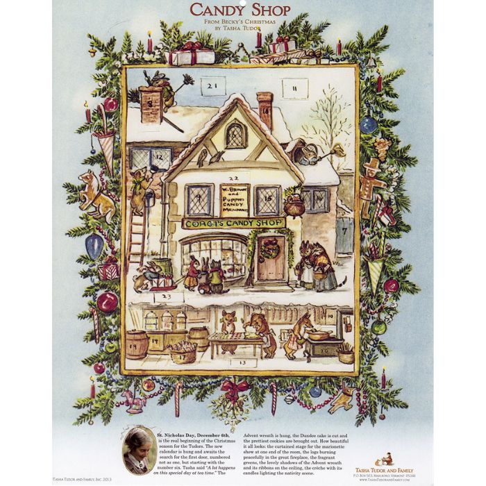 Bring back the treasured family tradition of a wall-hanging advent calendar with Tasha Tudor charm. While these advent calendar images were painted for the end papers of Becky's Christmas (1961), this has never been published as an actual advent calendar. We've combined images from other sources to add behind the flaps for a brand-new experience. Sure to delight!