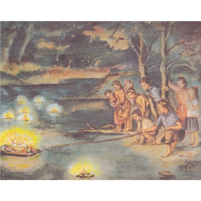 A beautiful, beloved Tasha Tudor birthday scene with a glowing cake floating down a river decked out with an array of colorful flowers and surrounded by a procession of smaller cakes being watched by a group of delighted children as the dusk settles the candles illuminate everything, a truly magical scene.
