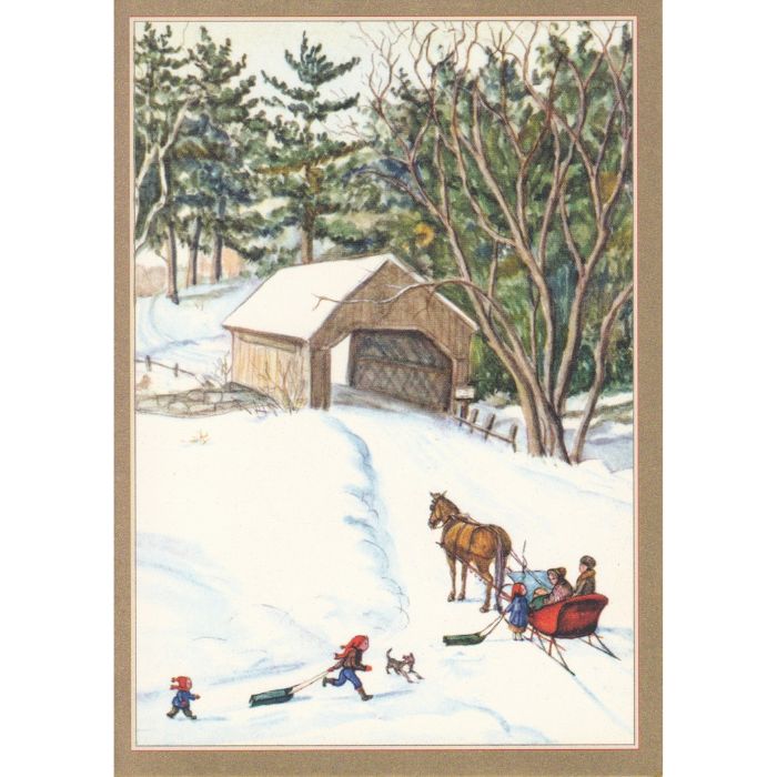 Single, out-of-print card perfect for your collection or a special gift. A classic Tasha Tudor New England scene of the children and animals chasing the sleigh toward the covered bridge.