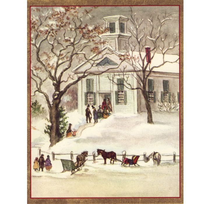 Tasha paints an old New England Christmas scene of parishioners arriving at church by horse and sleigh. A beautiful remembrance of times past.