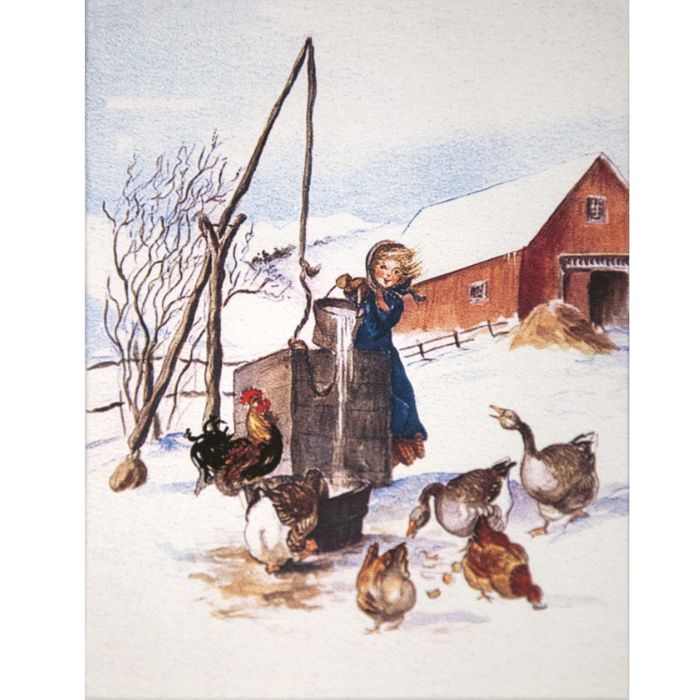 Tasha Tudor's depiction of a young girl tipping the bucket of fresh, icy cold well water into the drinking barrel for the geese and chickens. In the winter, water for the animals begins freezing as soon as it is poured and must be refreshed several times each day. Tasha remembered this scene of a girl at the well from her time in Redding, Connecticut.