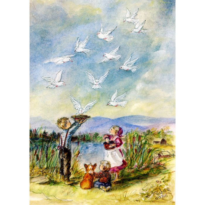 Tasha Tudor's lovely scene of Children with Doves is an image taken from a commissioned work. This card is blank inside and given the front image, can be used for a myriad of purposes.