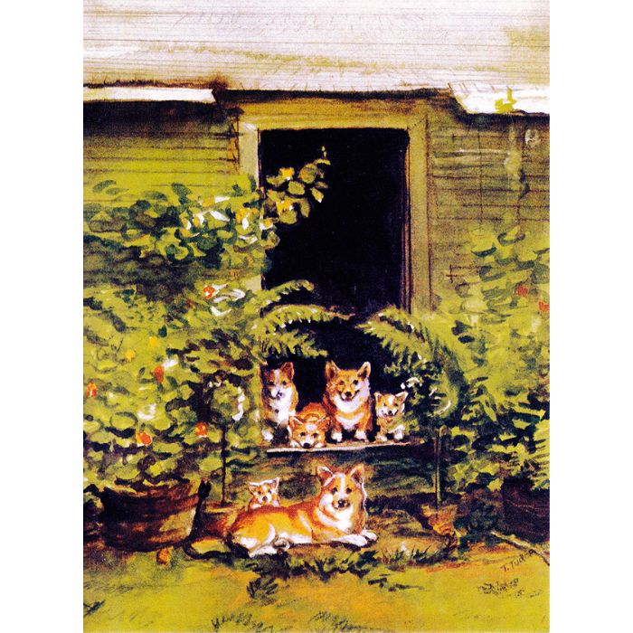 Tasha Tudor's corgis were an integral part of her daily routines. Visitors in the past would always come upon these corgis sitting on the back doorstep of her Vermont home: Owyn and Rebecca with their family. This family of corgis is just right to send happy notes of spring tidings.