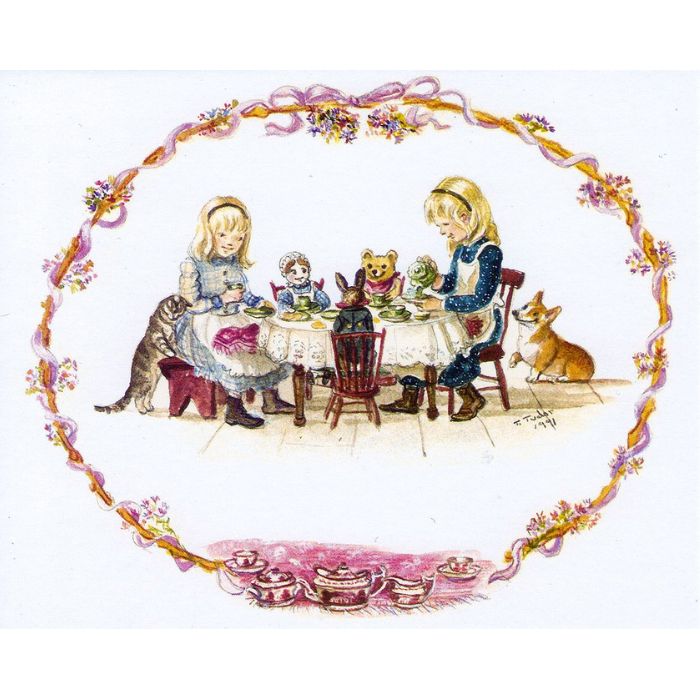 Tasha Tudor believes everyone should have a tea party now and then, especially when you're young and love your dolls and stuffed animals. This card reproduces a scene from when Tasha was a young mother, and her children were part of the daily environment from which she drew her inspiration. These make lovely invitations for tea parties, Easter gatherings, children's parties, or just a sweet note to share with a friend.