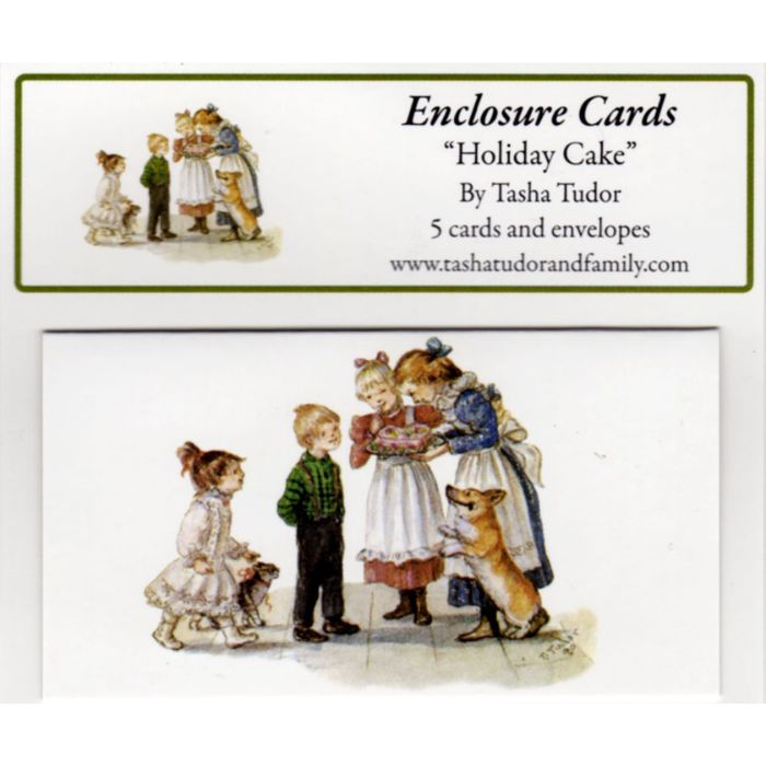 Celebrate the holiday season with Tasha Tudor's charming holiday cake-themed enclosure cards. The children exclaim over the beautiful holiday cake while a corgi tries to sneak a lick (they're good at that.) These are perfect for adding to party gift bags, tea party place settings, or children's Valentine's parties.