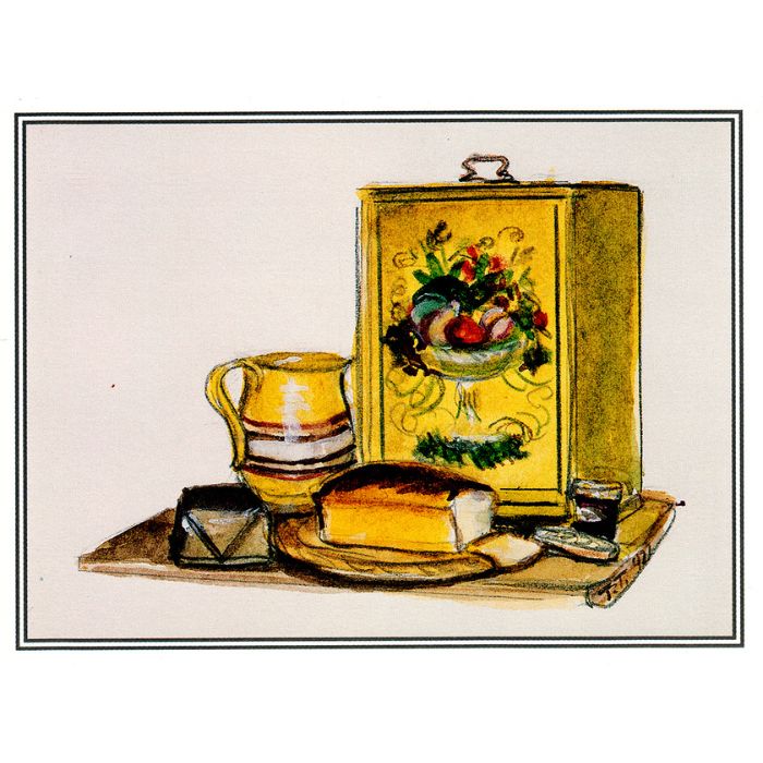 After Tasha Tudor baked a loaf of oatmeal bread, she would set it out to cool before the yellow bread box, as shown in the second image.