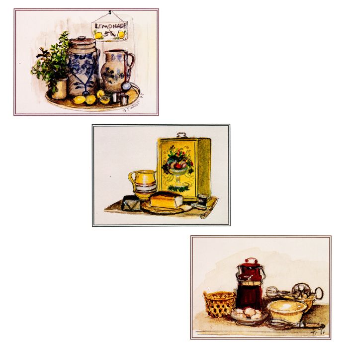 The third card showcases an assemblage of antique kitchen utensils indicating the forthcoming meal.