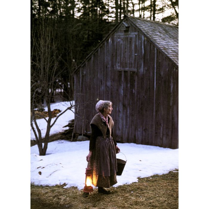 Tasha Tudor completes the last chore of the evening, bringing the pail back from feeding the goats. In early spring, the daylight hours are not as long as one needs, thus the lantern.