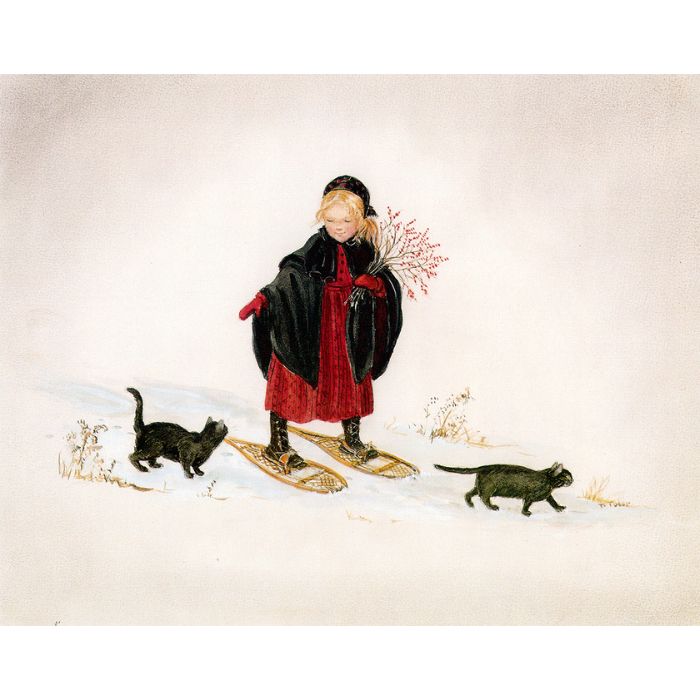 This is one of Tasha's favorite paintings and one of the most loved by Tasha's followers. Tasha's granddaughter, Laura, grew up next door to Tasha in Vermont, in the house Seth built for Laura's mother, Bethany. Here you can see Laura snowshoeing to pick some winter berries as two black cats, or perhaps kittens, wonder at what she is doing.