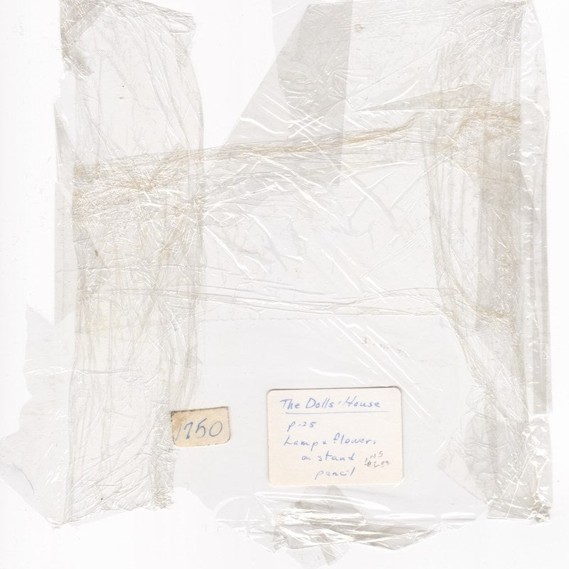 Recently reset within its original tan matte with photo corners and linen tape hinges. The original plastic wrap contains two stickers. One sticker displays the number “1750.” The other is the note typical of Dutch Inn pieces with the identifying note “The Dolls’ House p. 25 Lamp & flowers a stand, pencil” and later insurance value note was added by the owner “INS $200”