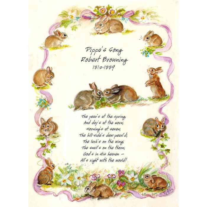 Tasha created this picture by drawing upon old sketches from her many sketchbooks to create this new and distinctive border. The playful rabbit border is brought together with bunches of springtime blooms and an elegant dance of pink ribbon to surround Robert Browning's poem, "Pippa's Song".
