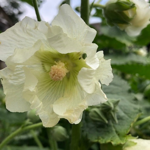 An interesting plant, many individuals have lobed leaves instead of the round leaves of modern hollyhocks. This strain originated in Tasha's Great-Grandfather's garden in Bourne, Mass. He was known as the "Ice King" and lived from 1783-1864. This variety will bloom its second year and will continue for a handful of years after that. Cut back after blooming and the plant puts energy into seed development to encourage a long life.