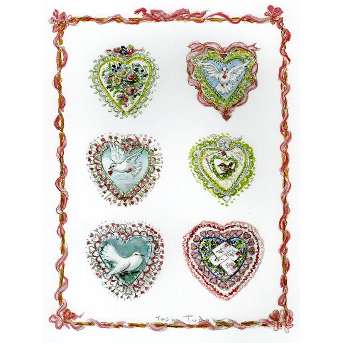 This lovely print shows six distinctly Tasha Tudor Valentines as she would paint them in the first step of yearly Valentine making. They are bordered by twigs wrapped with pink ribbon. Enjoy this piece as a framed print or cut out the hearts and make Valentines for your loved ones!