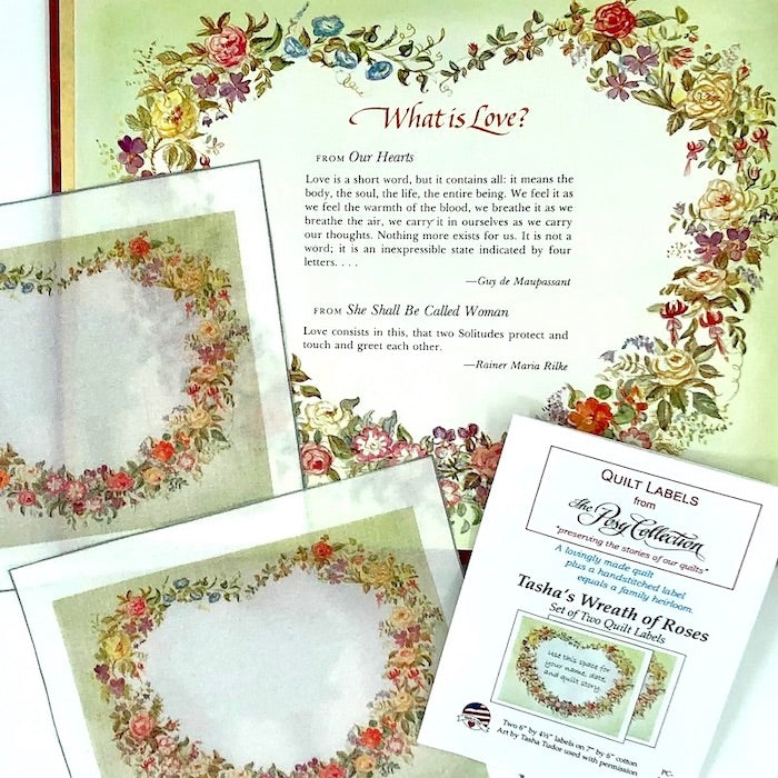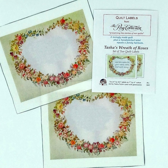 Tasha Tudor's Wreath of Roses set of two quilt labels is perfect for inscribing your heartfelt gift inscription to the back of a baby quilt, wedding quilt, or any other number of milestone gifts for your loved ones.